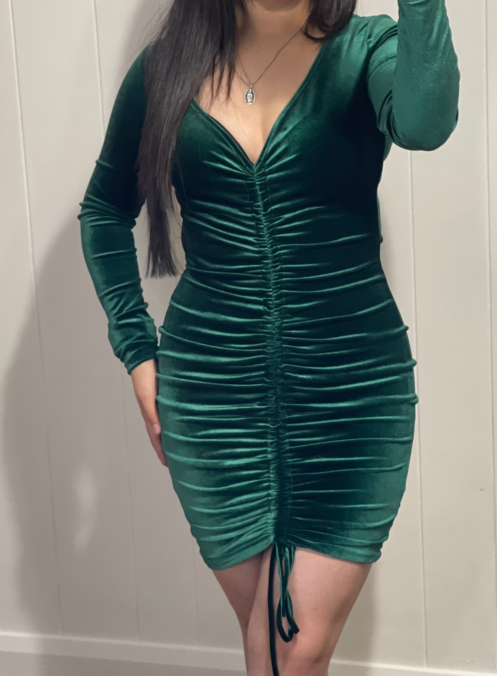 Hunter Green drawstring long-sleeve velvet dress perfect for any type of season fall, winter, spring. Material is comfortable & able to adjust to your liking with the drawstring.