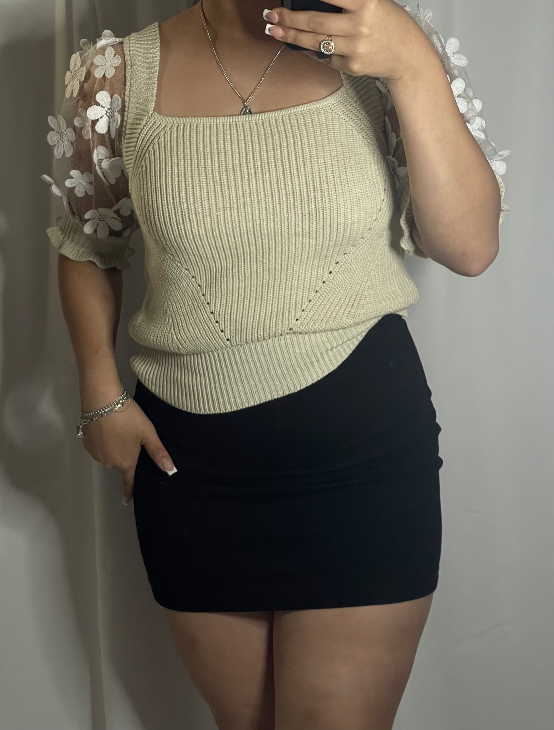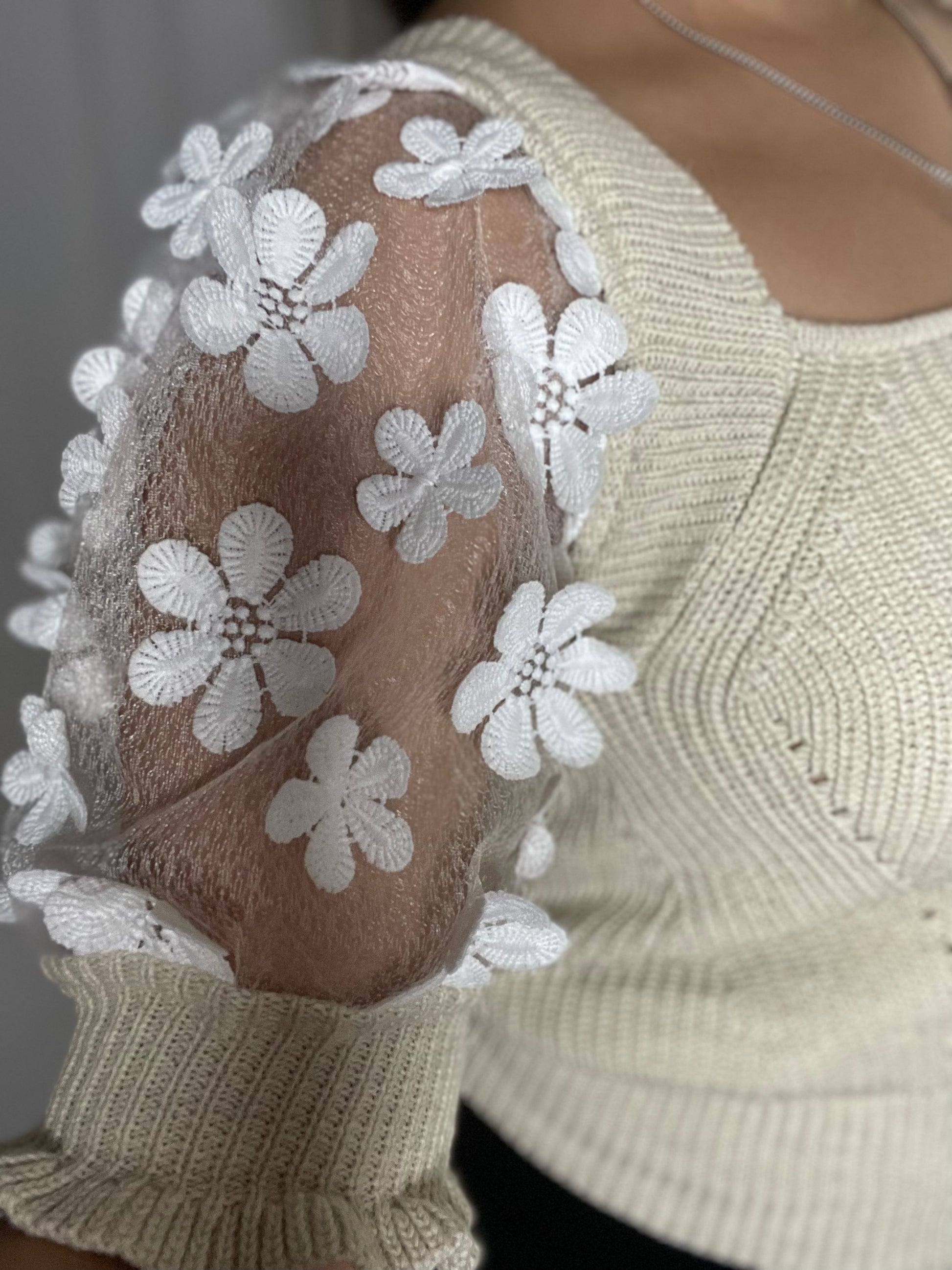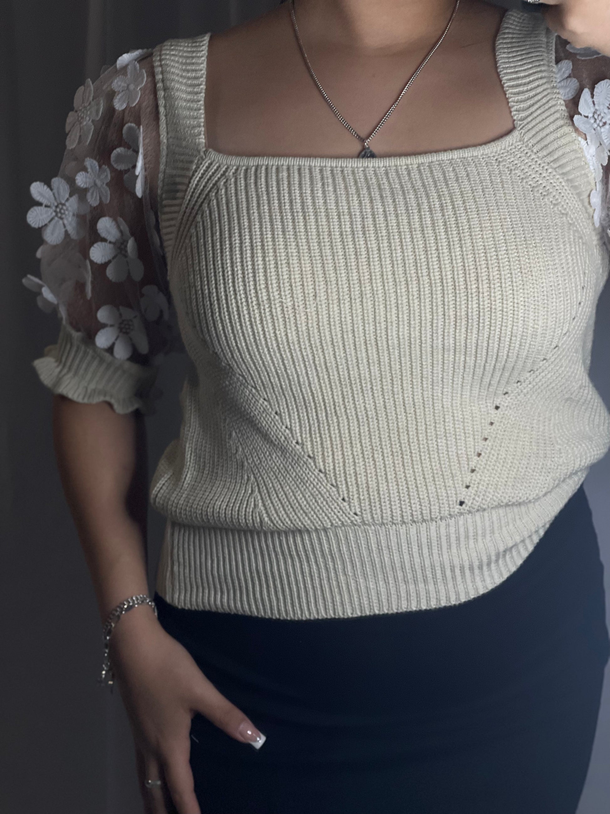Floral lace puff sleeve, square neck knit sweater top. Super different but a very pretty top, oatmeal color, true to size.
