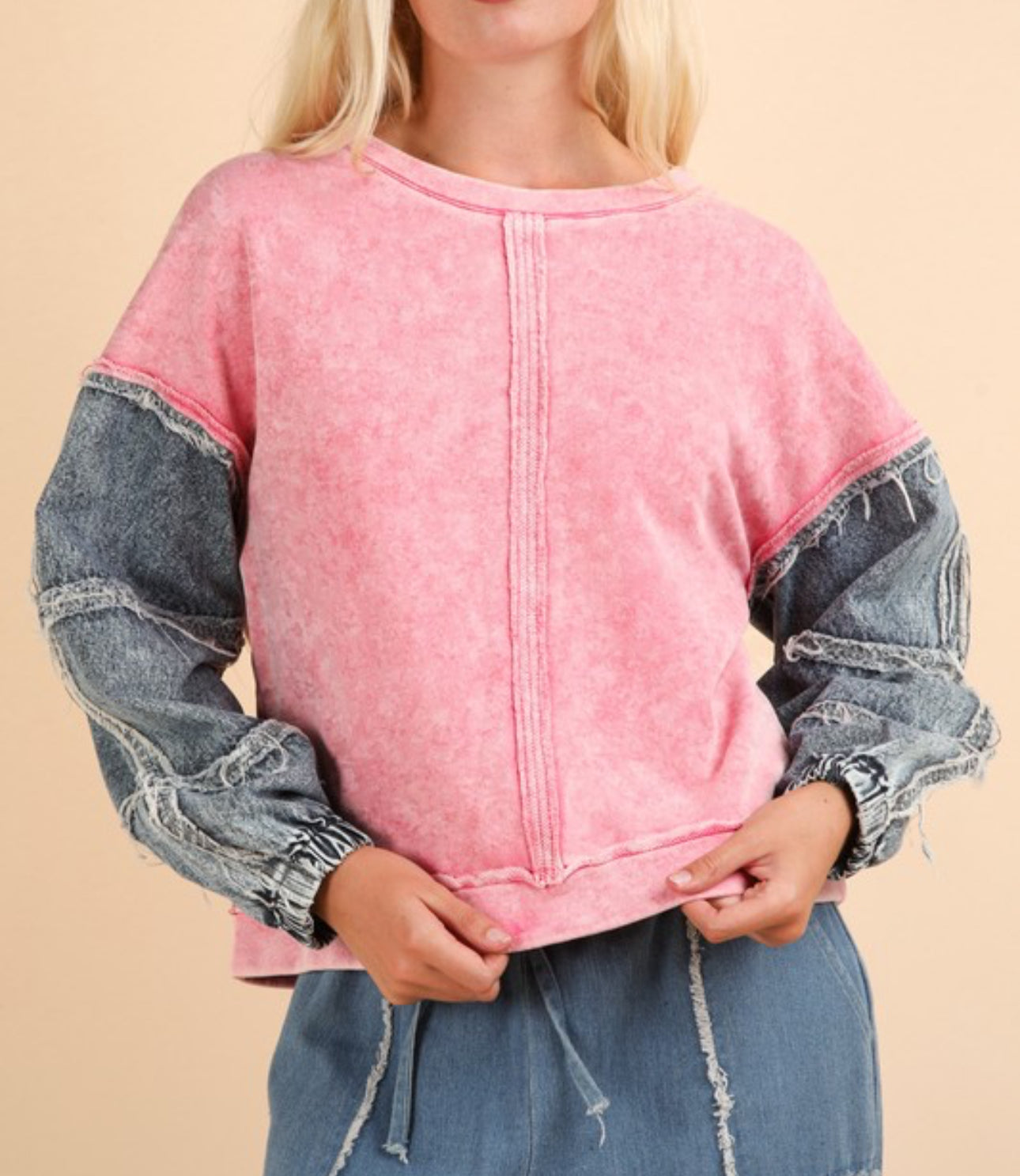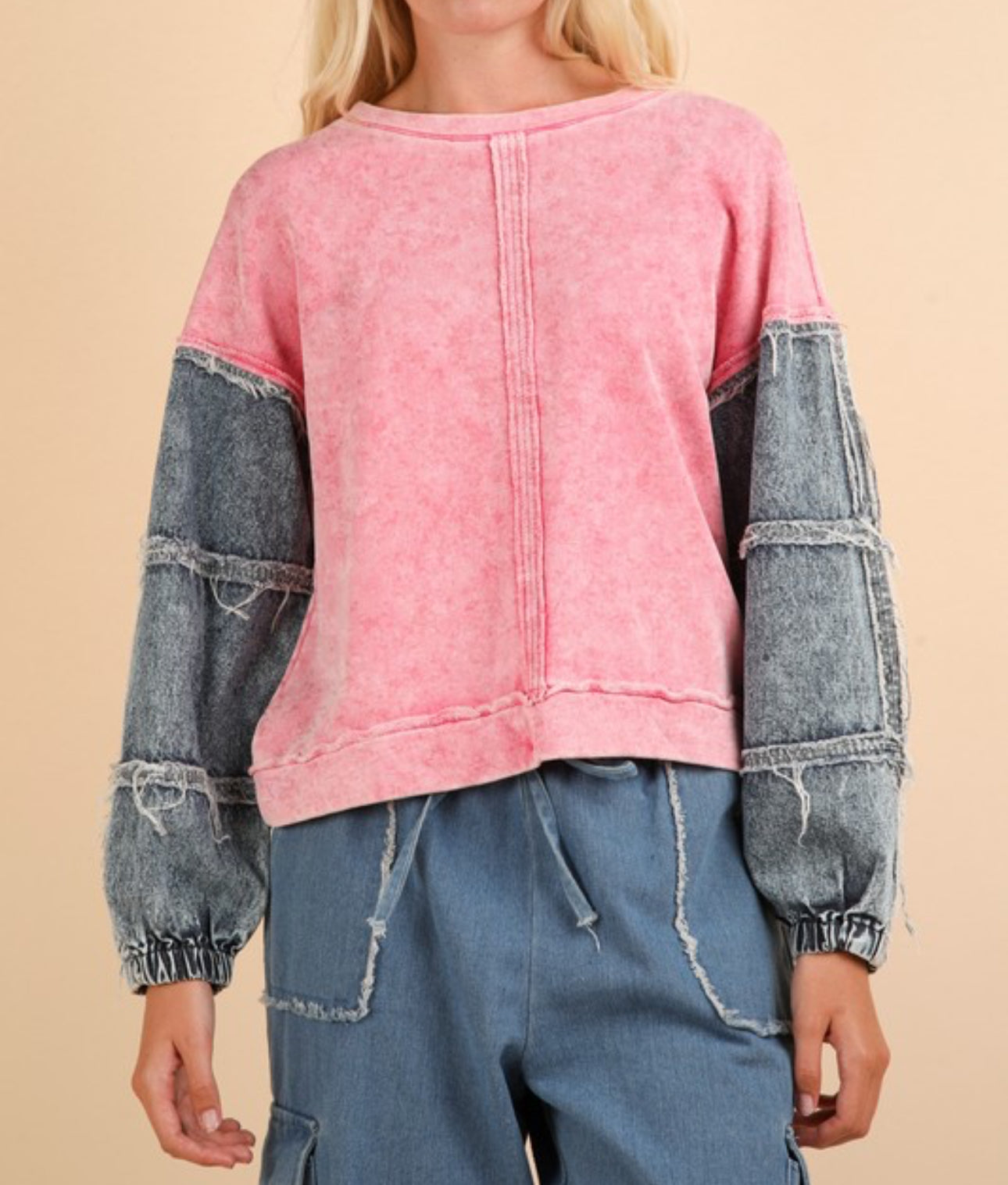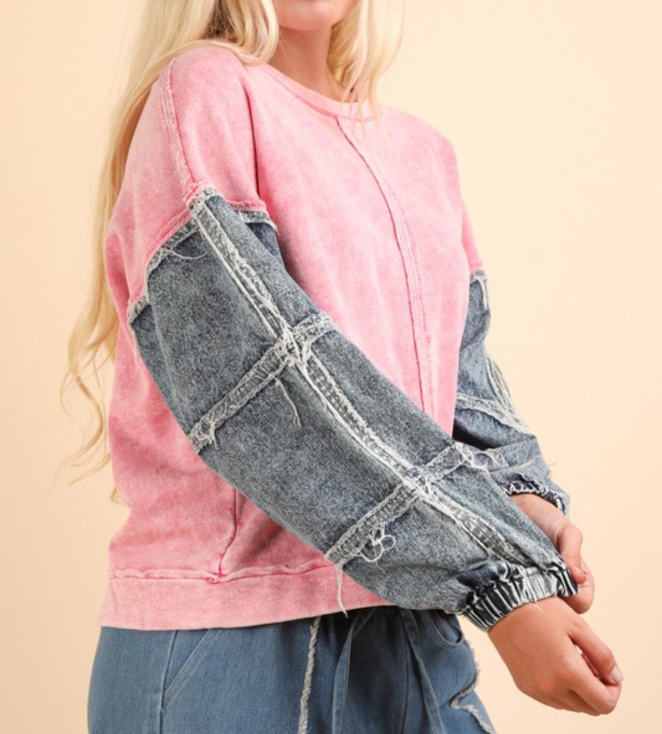 Acid washed denim sleeve casual top. Long sleeve, round neck. Very different top from others. The shade of pink is very nice.