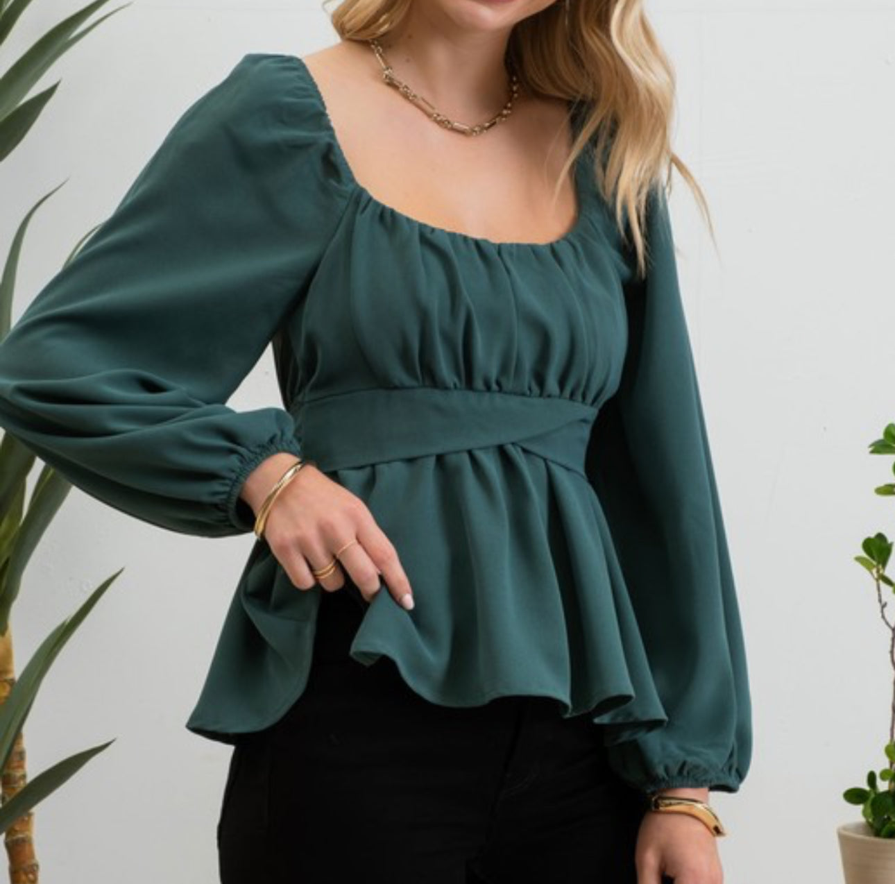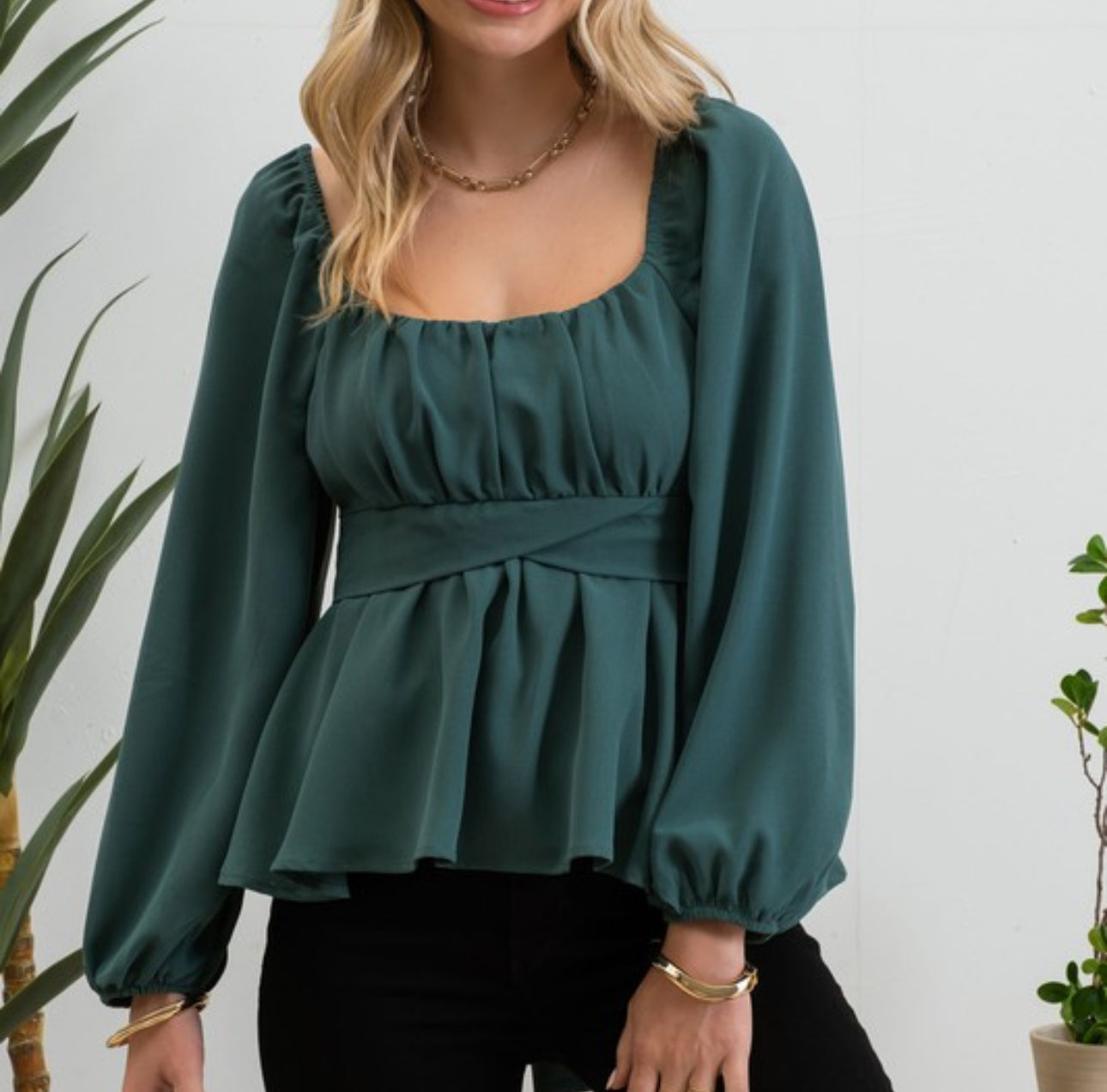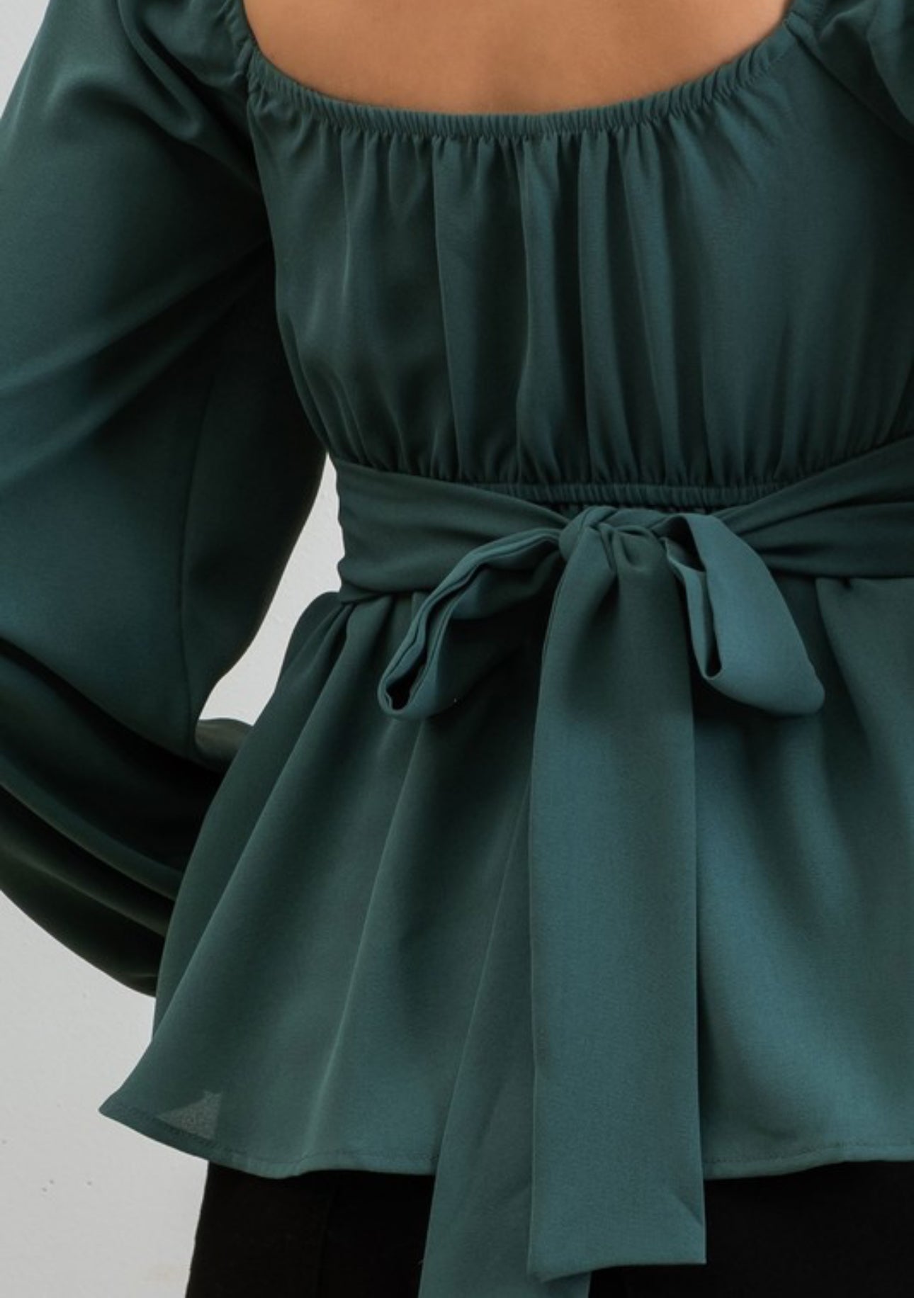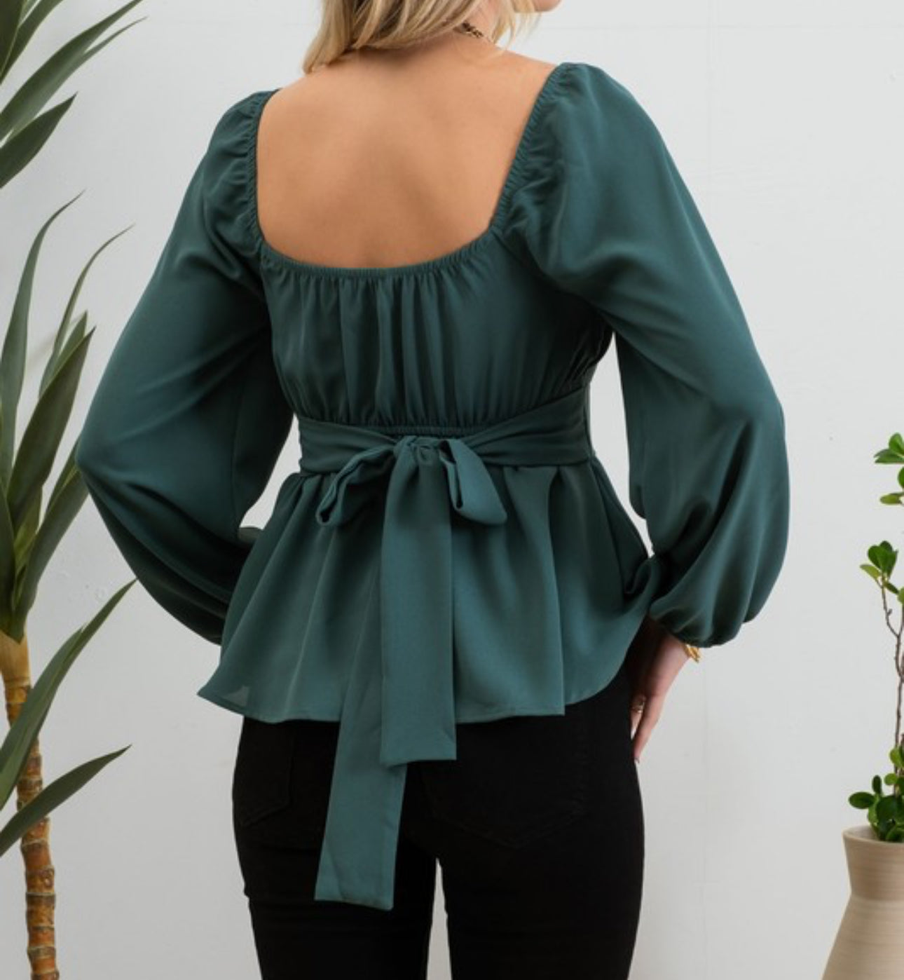 Scoop neck long sleeve back waist tie blouse. Very pretty color for the holidays.