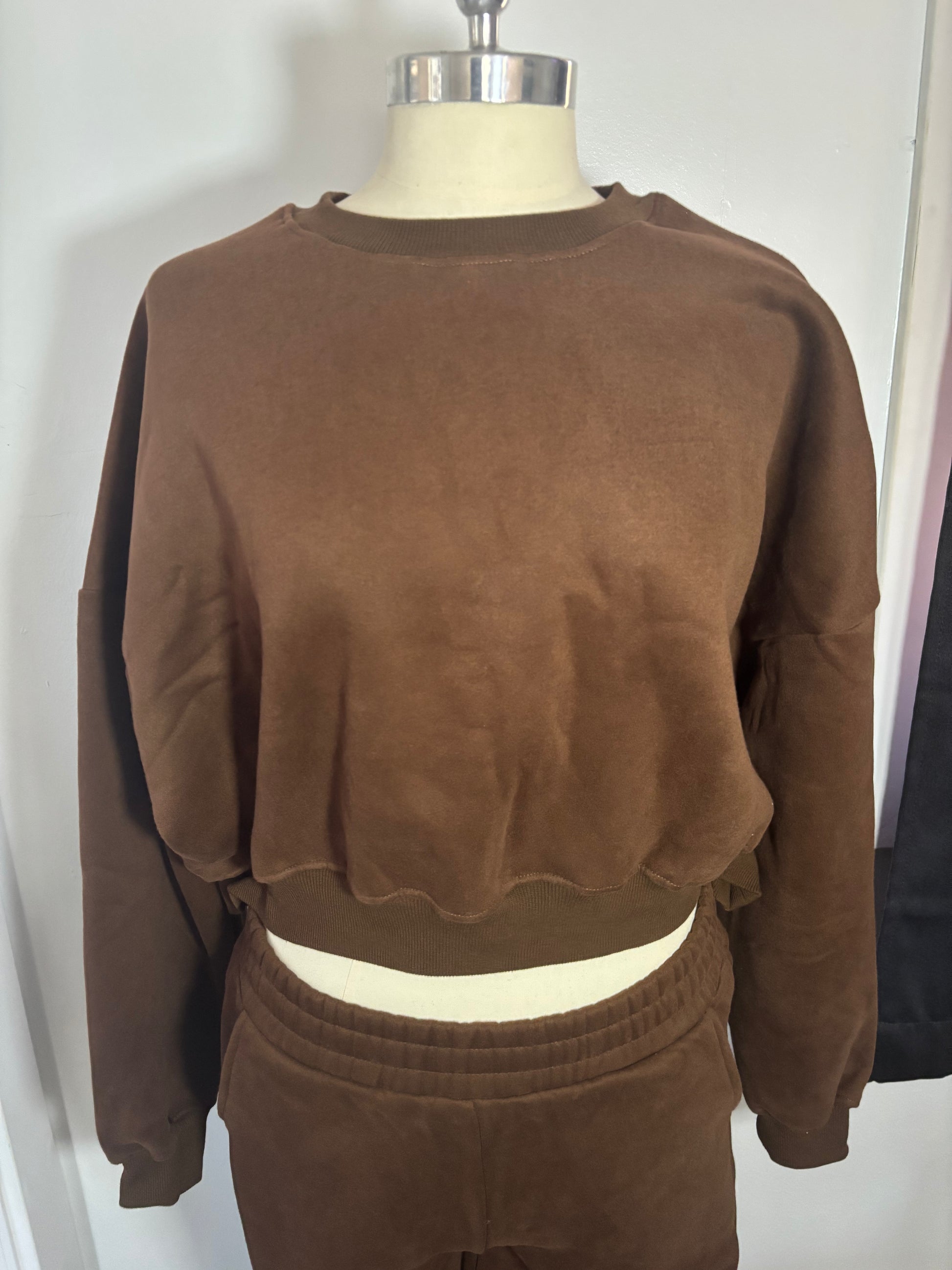 Cozy fleece oversized crewneck sweatshirt. Prefect crewneck to layer up, really good quality. Very nice brown color. Not to cropped but not full length, wide at the bottom.