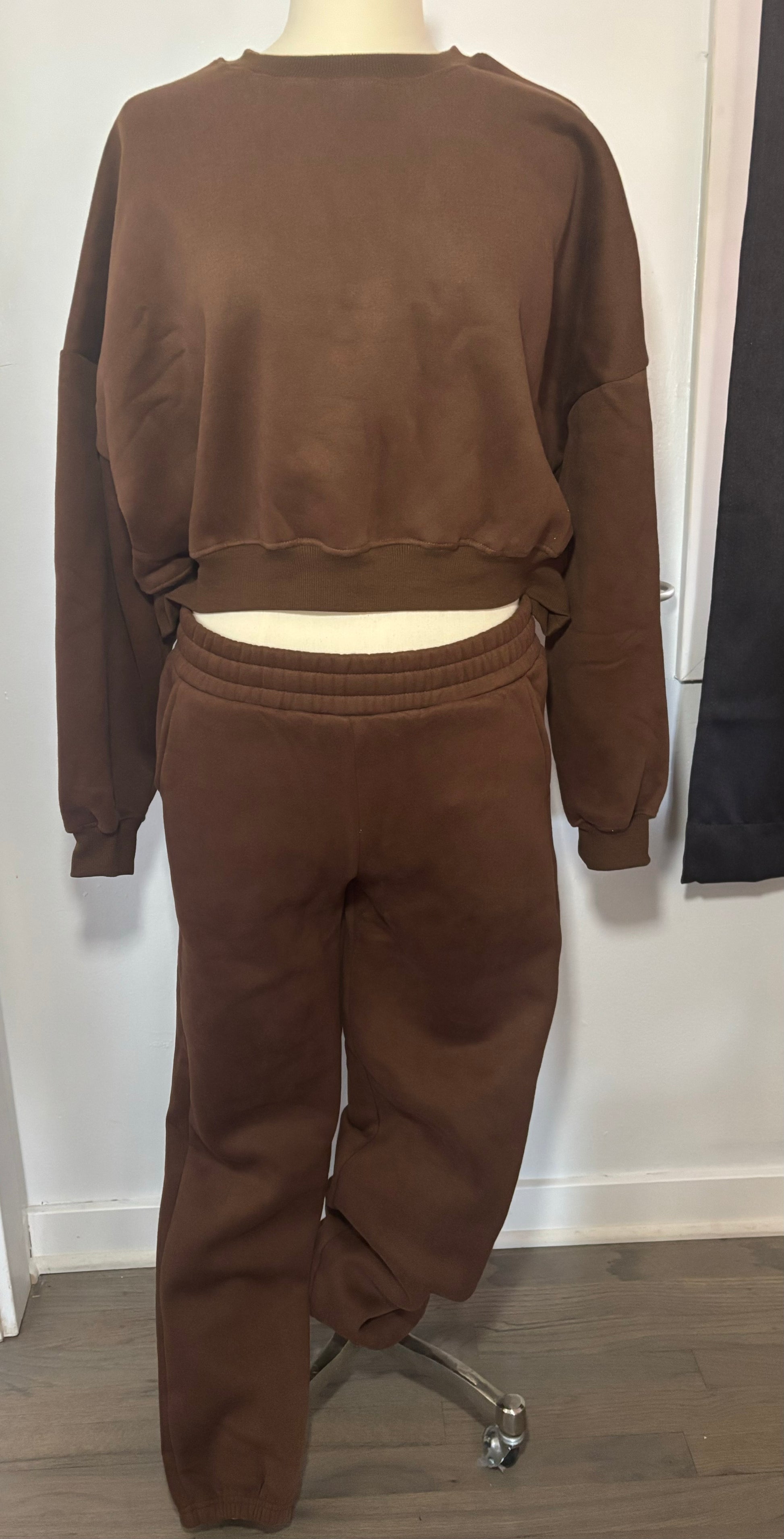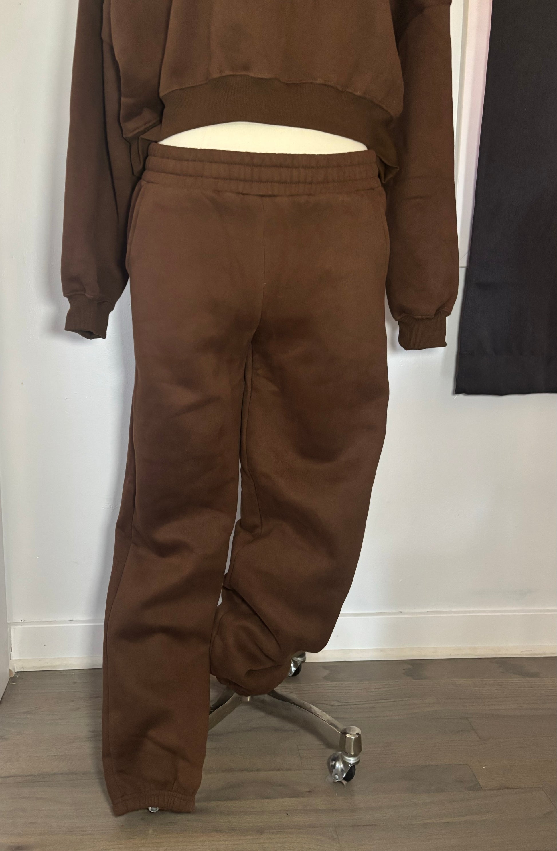 Fleece jogger sweatpants. Very good quality and very pretty brown color. Does have an elastic waistband.