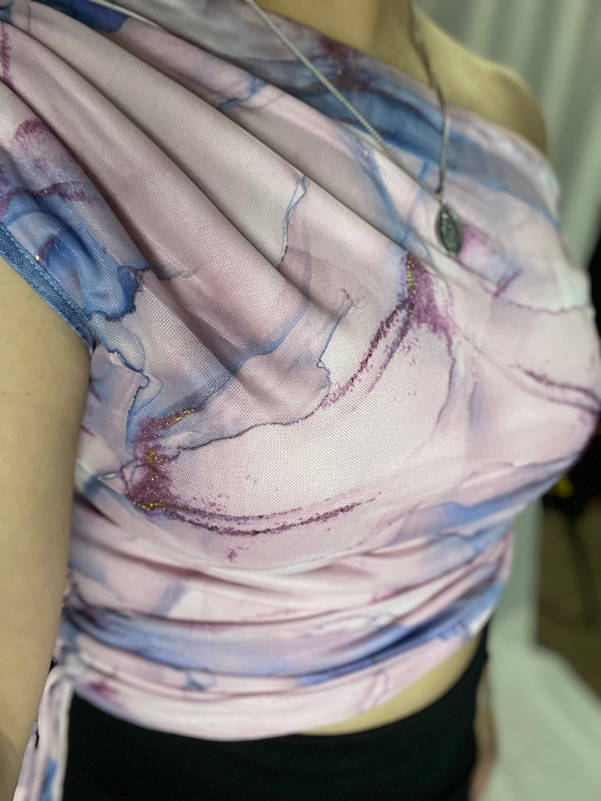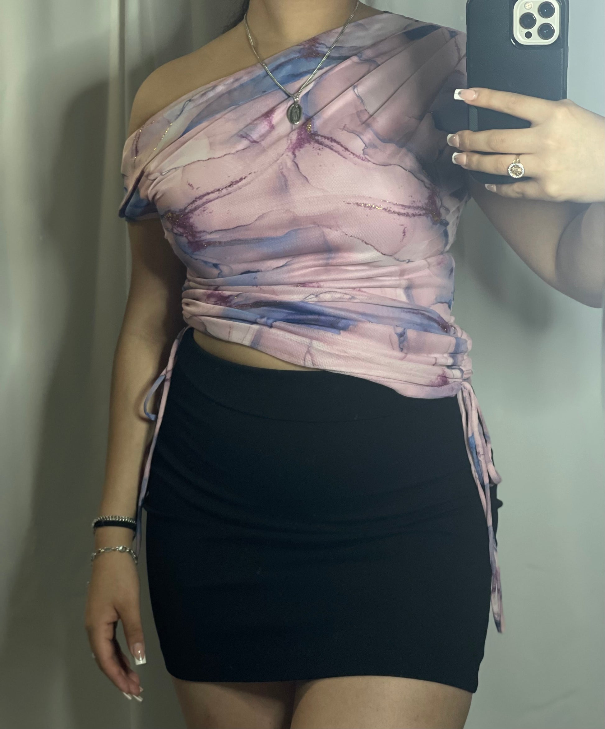 Off the shoulder mesh marble print top. Could be adjusted on the sides with tie. Beautiful colors!