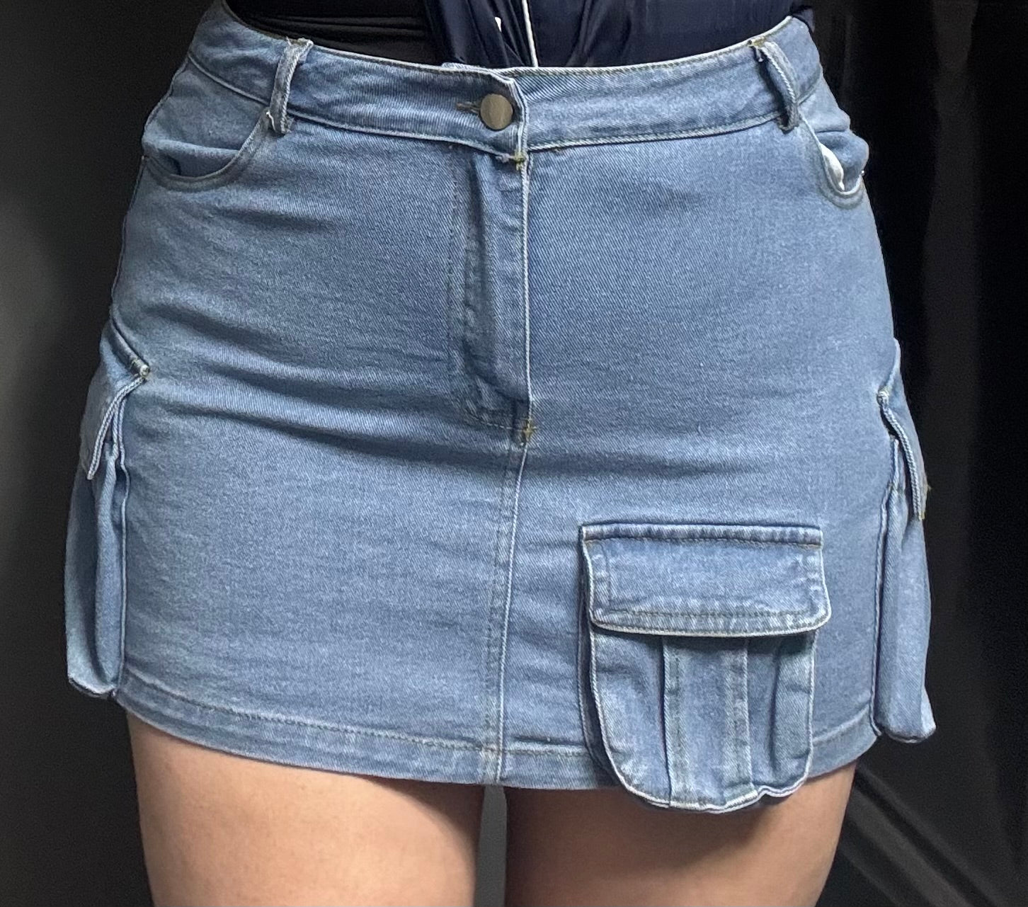 High rise cargo light denim skirt. Zipper and button closure. Multiple pockets on the front area. Does not come with extra stretch, but it is true to size.
