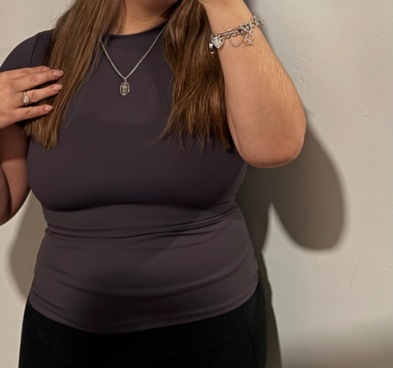 Body hugging fitted tee, your go to tee! Very pretty color ! Lightweight with just the prefect amount of stretch-perfect for training, running or layering post-workout